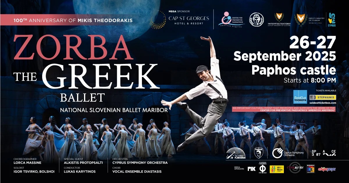 26 и 27 сентября 2025 года, Пафосский Замок станет великолепной декорацией для балета под открытым небом «Грек Зорба», поставленного по знаменитому роману Никоса Казандзакиса на музыку великого греческого композитора Микиса Теодоракиса.