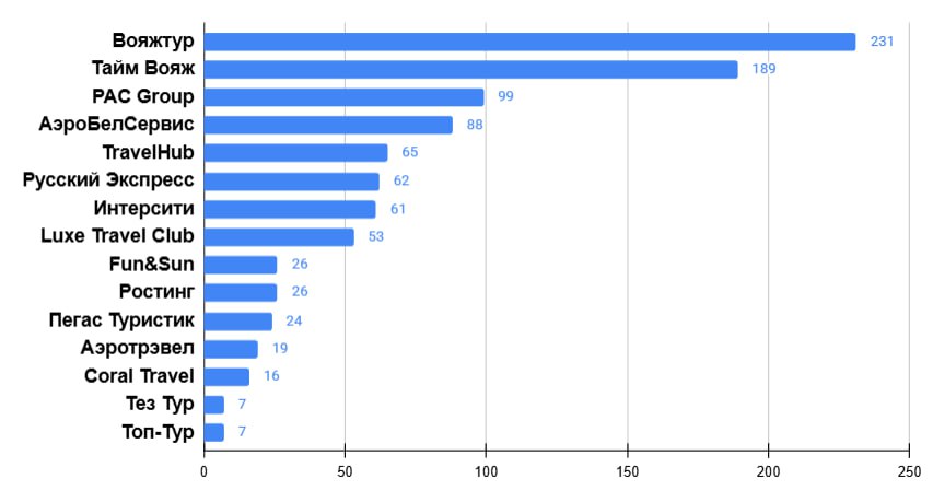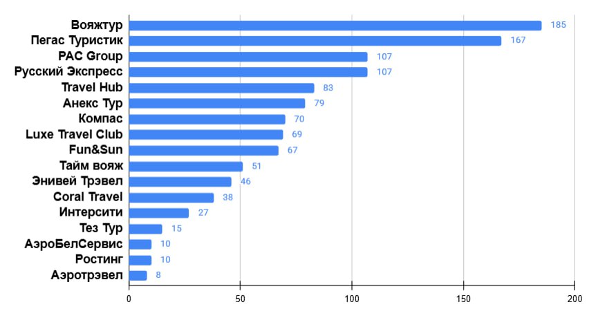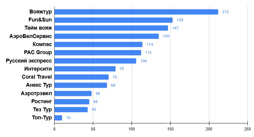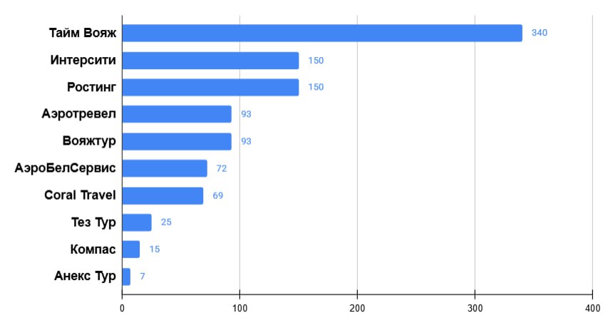 На второй позиции – «Пегас Туристик», что не является неожиданностью. Оператор фрахтует борта у авиакомпаний-партнеров и загружает самолеты из Москвы по некоторым ключевым экзотическим направлениям – Куба, Венесуэла. Третье, четвертое и пятое место занимают PAC Group, «Русский экспресс» и TravelHub.