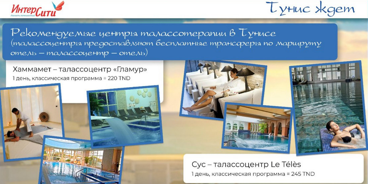 Талассотерапия – один из самых популярных тунисских брендов. Собираясь в поездку в эту страну, постарайтесь запланировать посещение местных талассоцентров, без этого поездка в Тунис, пожалуй, не будет полной.